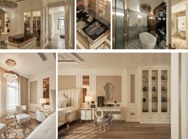 Ngay từ phòng khách đã toát lên sự đẳng cấp với tủ trưng bày giày dép, túi xách hàng hiệu được thiết kế dạng kính trong suốt, ánh đèn phản chiếu khiến từng món đồ lấp lánh như bước ra từ một boutique cao cấp. Bên cạnh đó, nội thất chính được phủ gam màu trắng - vàng chủ đạo, mang lại cảm giác vừa hiện đại vừa gợi nhớ đến phong cách hoàng gia châu Âu.
