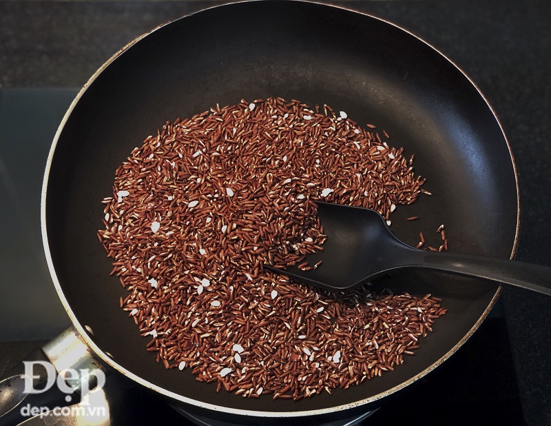– Vo gạo và gạn sạch bụi bẩn. Rang gạo trên lửa vừa trong 5-7 phút, đến khi gạo dậy mùi thơm và tầm ⅕ lượng gạo nổ bông lên thành những hạt trắng.