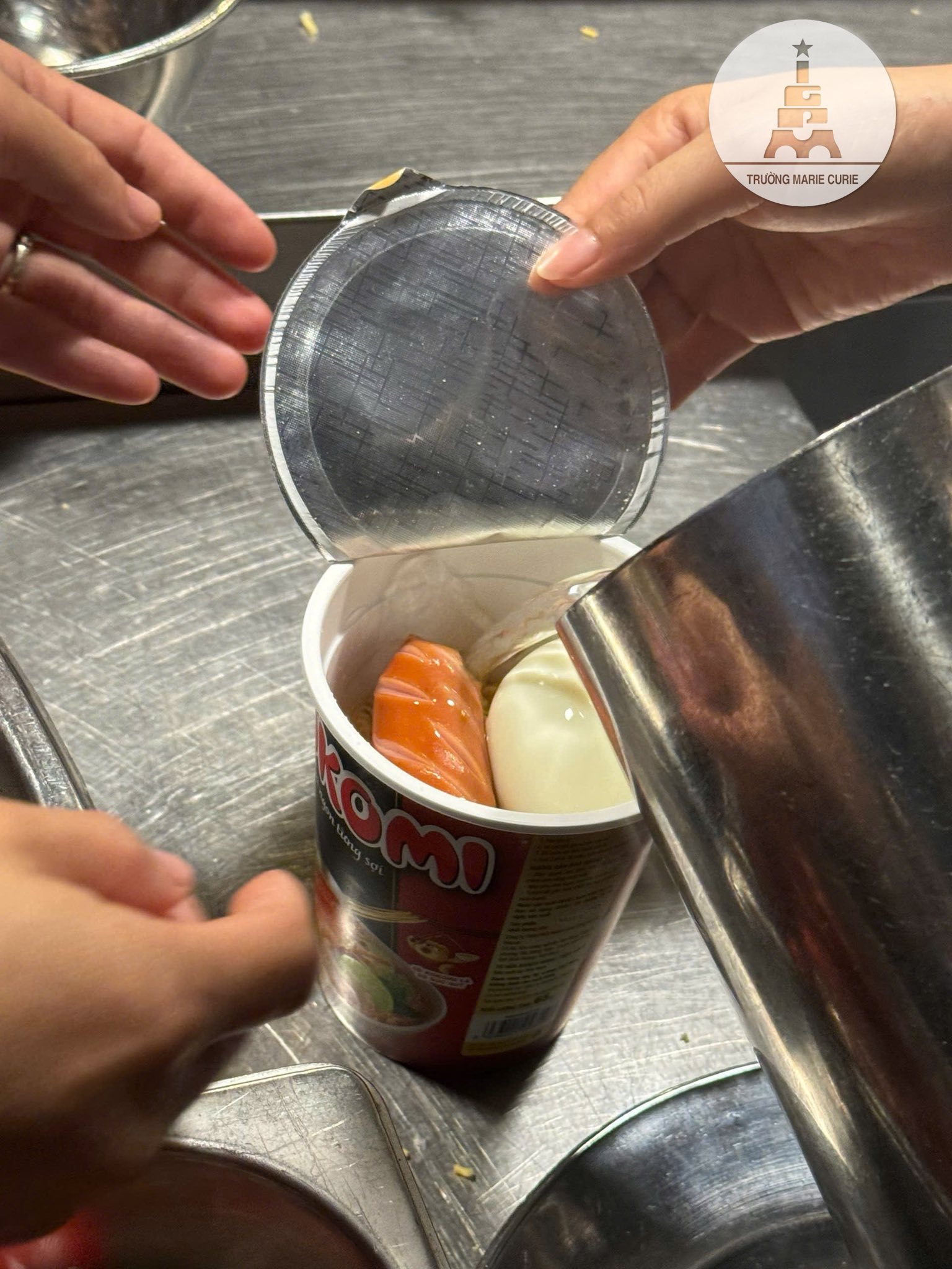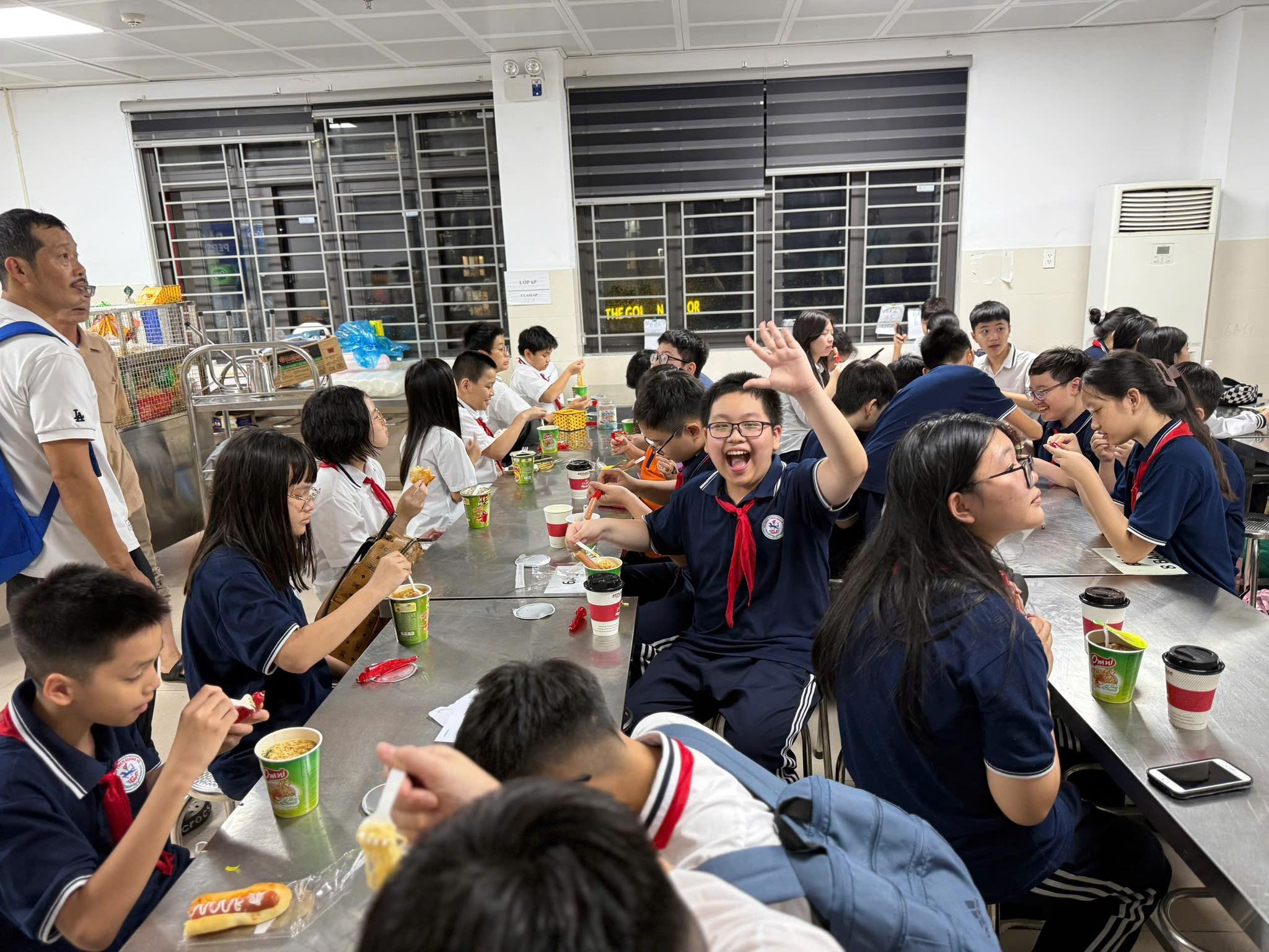 Ở trường Marie Curie, các bạn học sinh cũng có một buổi tối khó quên khi cùng nhau ngồi quây quần thưởng thức bữa ăn ấm lòng, biến một ngày mưa ngập đáng ngại thành kỷ niệm tuổi học trò đặc biệt. Bữa ăn được phục vụ bởi canteen trường với menu phong phú, nào mỳ, nào cháo...